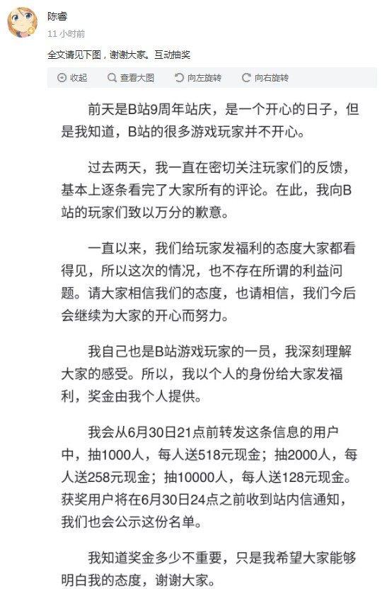 之后董事长陈睿发文像FGO玩家表示道歉,个人会发放230万现金作为抽奖福利,但是这个奖是发给B站所有人,而不是FGO玩家。